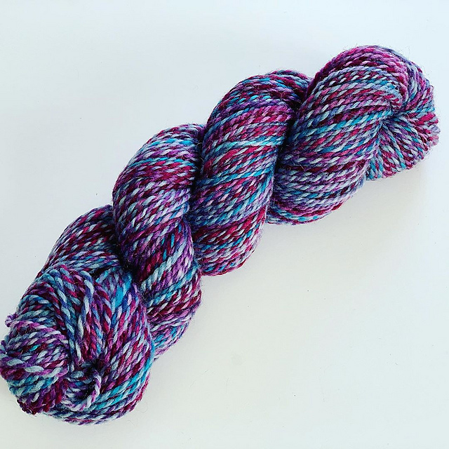 This yarn came from a local festival. I got to meet the alpaca it's from! He's black and white and these twisted fibers are both from him. I made this into a pair of mittens and have a tiny bit left.
